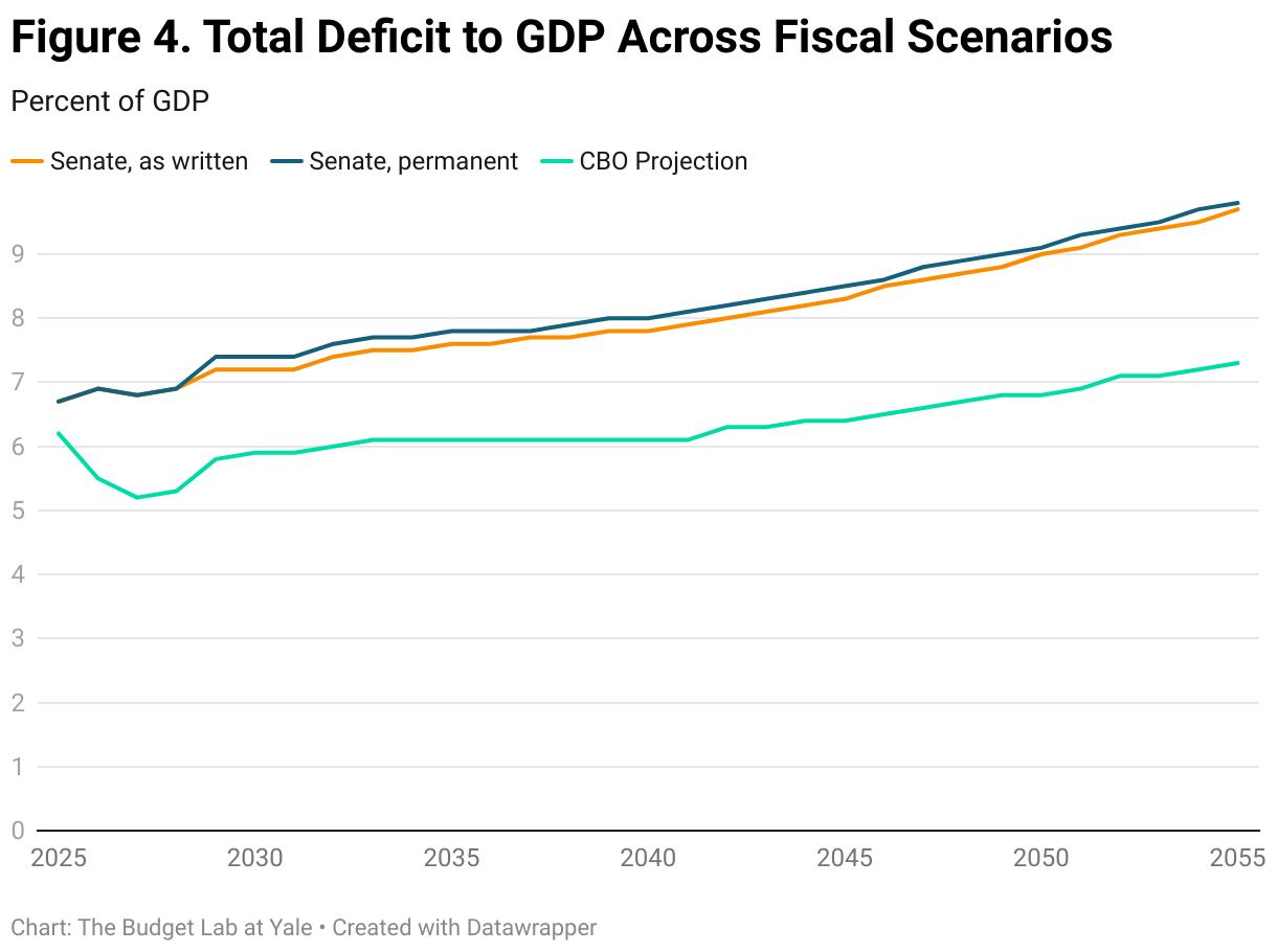 The tax provisions in the budget bill introduced by the Senate Finance Committee on June 16 would add $4.1 trillion to the debt over the 2025-2034 window (1.15% of GDP over this time period) and $19.4 trillion from 2025-2055 (1.14% of GDP over this time period).