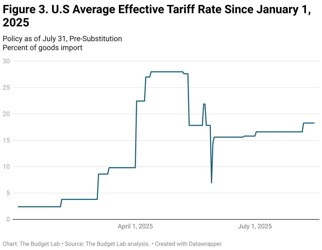 Measured pre-substitution—assuming there are no shifts in the import shares of different countries—the 2025 tariffs to date (including the ones effective August 7) are the equivalent of a 15.9 percentage point increase in the US average effective tariff rate. That calculation assumes that, for example, the share of imports from China remains at 14%, where it was in 2024. This is the right way to think about the tariffs from the perspective of consumer welfare, since it reflects the full cost faced by consumers before they start making difficult spending choices. This increase would bring the overall US average effective tariff rate to 18.3%, the highest since 1934.