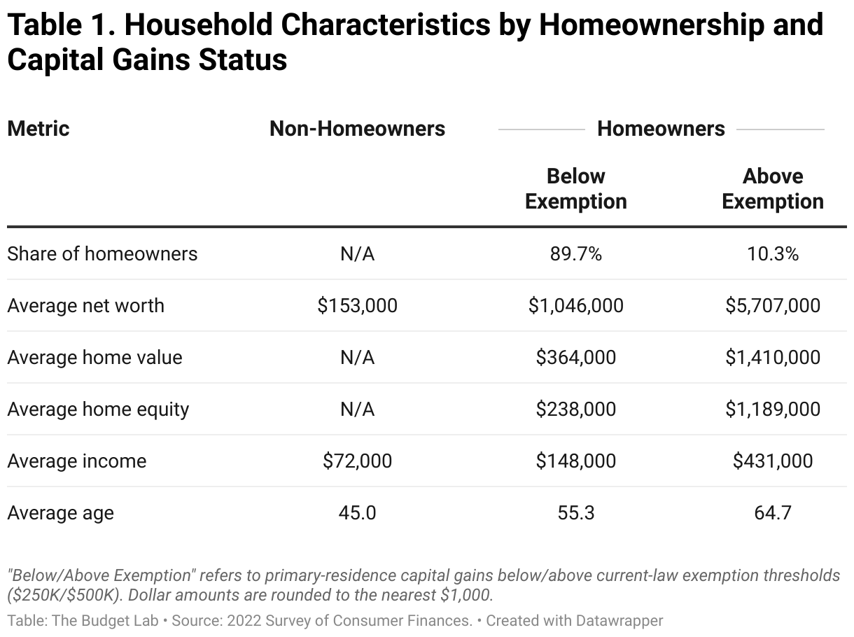 Current law allows for up to $500,000 of capital gains on primary residences to be excluded from tax. Those with gains above exemption are wealthier, higher-income, and older than homeowners below the threshold. In 2022, the average net worth for this group was $5.7 million.